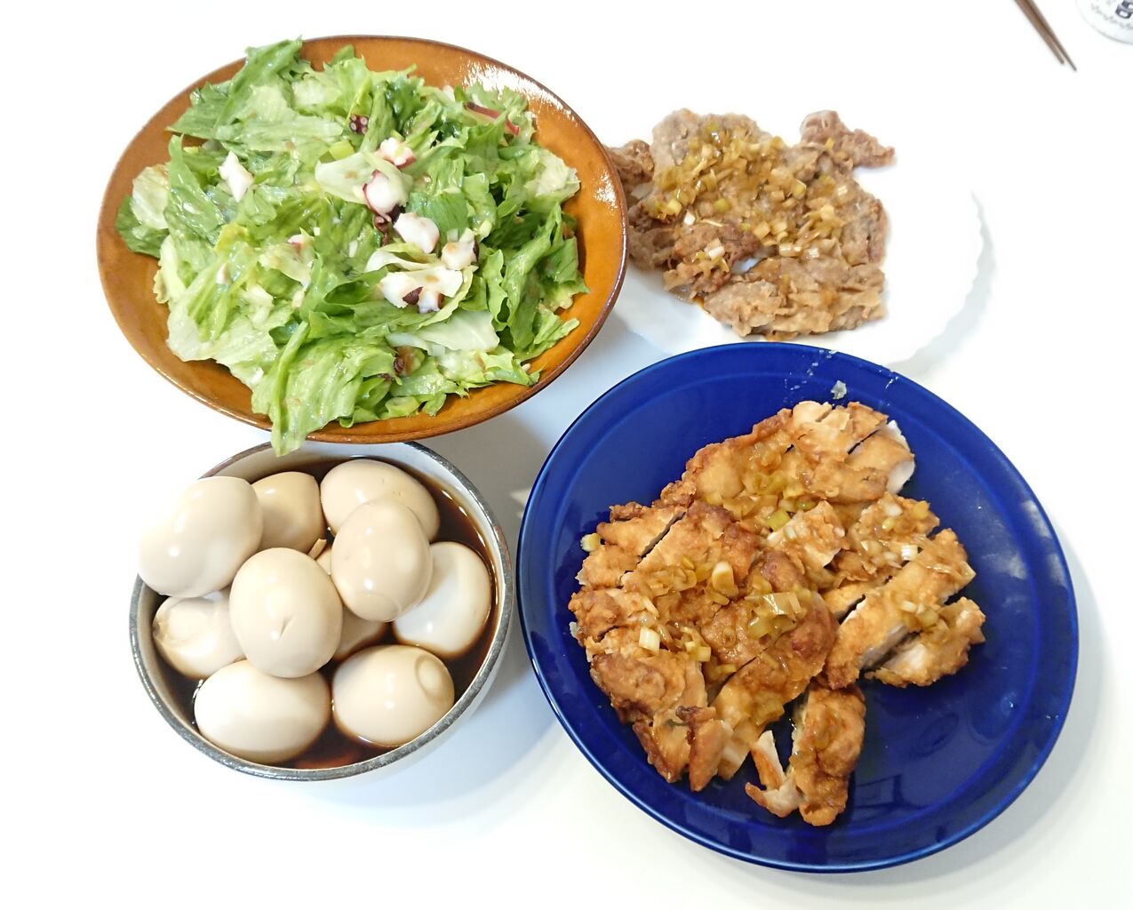 タコサラダ、煮卵、揚げ鶏と揚げ豚のネギソースがけです